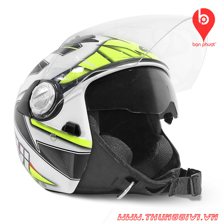 Bên cạnh đó Nón bảo hiểm ¾ GIVI Vista có hệ thống 2 kính, một kính ngoài màu trong giúp chống bụi, đất đá,… kết hợp với một kính màu tối bên trong có thể bật lên /xuống nhanh chóng để bảo vệ mắt người đội khỏi tia UV khi đi dưới ánh nắng mặt trời, hay cần bật lên khi đi trong điều kiện thiếu ánh sáng như đi vào ban đêm